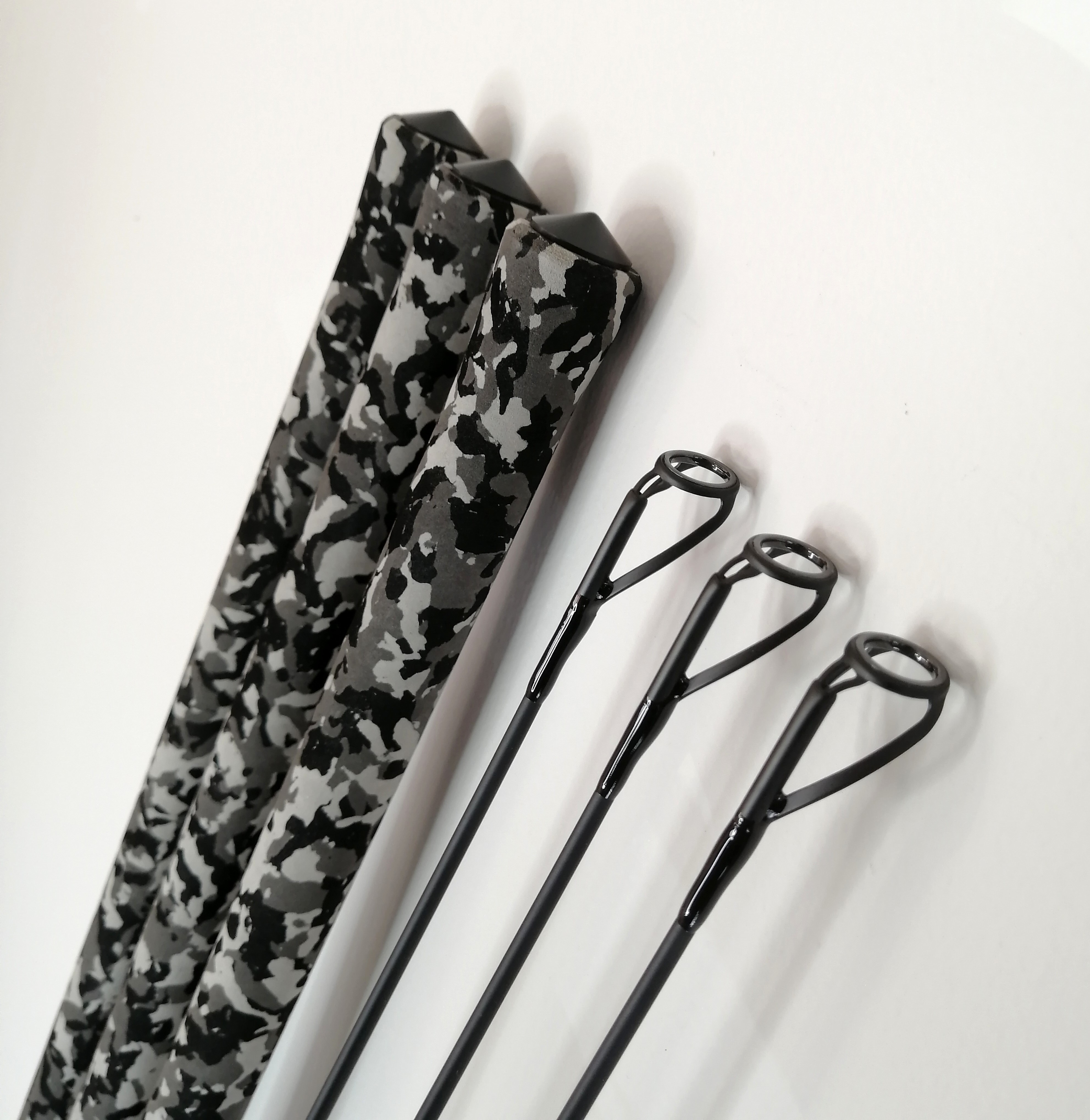 High Performance 11ft 3.75lb set with full snow camo duplon grip, features ultra-light 50mm guide sets, AT comfort finish reel seats with a mixture of Gunsmoke and black accents, classic Carbon Carp finishing with white thread inlay.